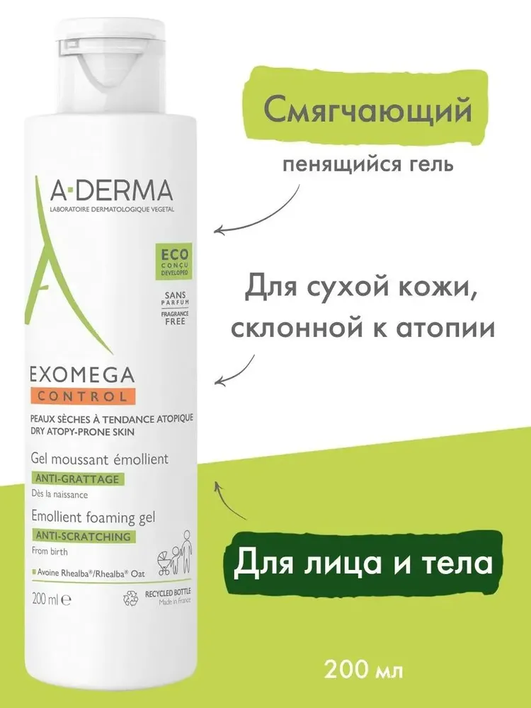 Смягчающий пенящийся гель для сухой кожи A-Derma EXOMEGA CONTROL 200 мл