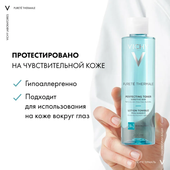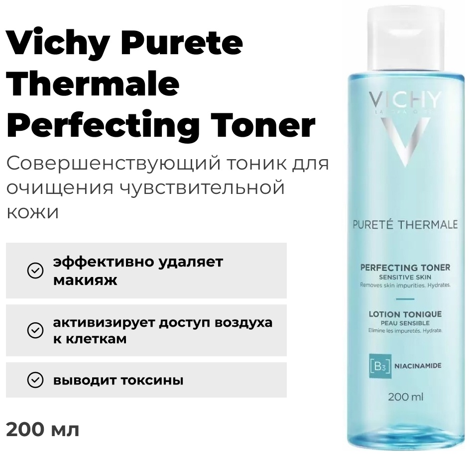 Совершенствующий тоник Vichy Purete Thermale завершает ежедневную процедуру очищения, освежая чувствительную кожу. Бережно и эффективно удаляет остатки макияжа, не оставляя липкой пленки. АКТИВНЫЕ ИНГРЕДИЕНТЫ: — Ниацинамид, также известный как витамин В3, успокаивает и защищает кожу. — Вулканическая термальная вода Vichy восстанавливает, укрепляет и защищает кожу. ЭФФЕКТИВНОСТЬ: Увлажняет, придает ощущение мягкости кожи, удаляет загрязнения. Кожа выглядит свежей и чистой.