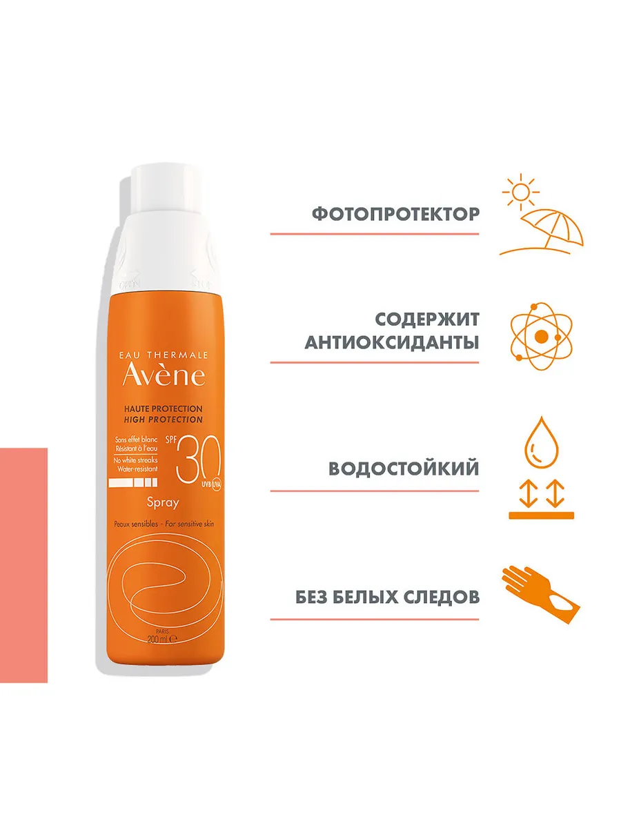 Спрей солнцезащитный Avene High protection lotion spray SPF 30+ разработан для защиты чувствительной кожи от солнечных коротких и длинных UV-А и UV-B лучей. Благодаря минимальному содержанию химических фильтров спрей создает бережный защитный барьер на коже, не раздражая ее. Уникальный солнцезащитный комплекс компонентов вместе с термальной водой Avene защищает кожу от действия свободных радикалов, смягчает и успокаивает ее. Спрей солнцезащитный Avene High protection lotion spray SPF 30+ легко распределяется по коже, проявляет устойчивость к воздействию влаги.