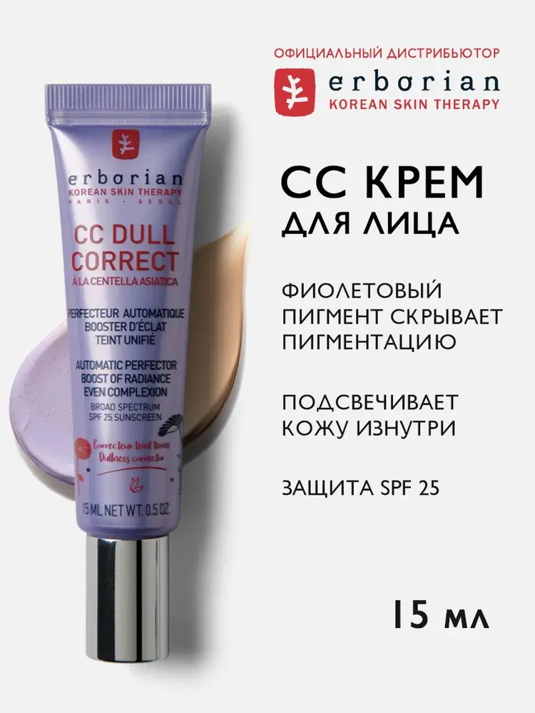 ERBORIAN CC Dull Корректирующий крем для лица, 15 млМультифункциональная формула праймера для лица CC Dull мгновенно борется с тусклостью кожи, возвращая ей сияние. Фиолетовый пигмент скрывает пигментацию и другие несовершенства, выравнивая тон и подсвечивая кожу изнутри.