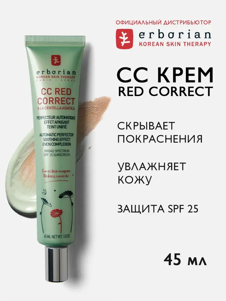 ERBORIAN CC RED Корректирующий крем для лица, 45 млCC RED Корректирующий крем для лица – это универсальное средство, которое содержит особые зеленые «СС-пигменты», помогающие скрыть покраснения и другие несовершенства кожи.