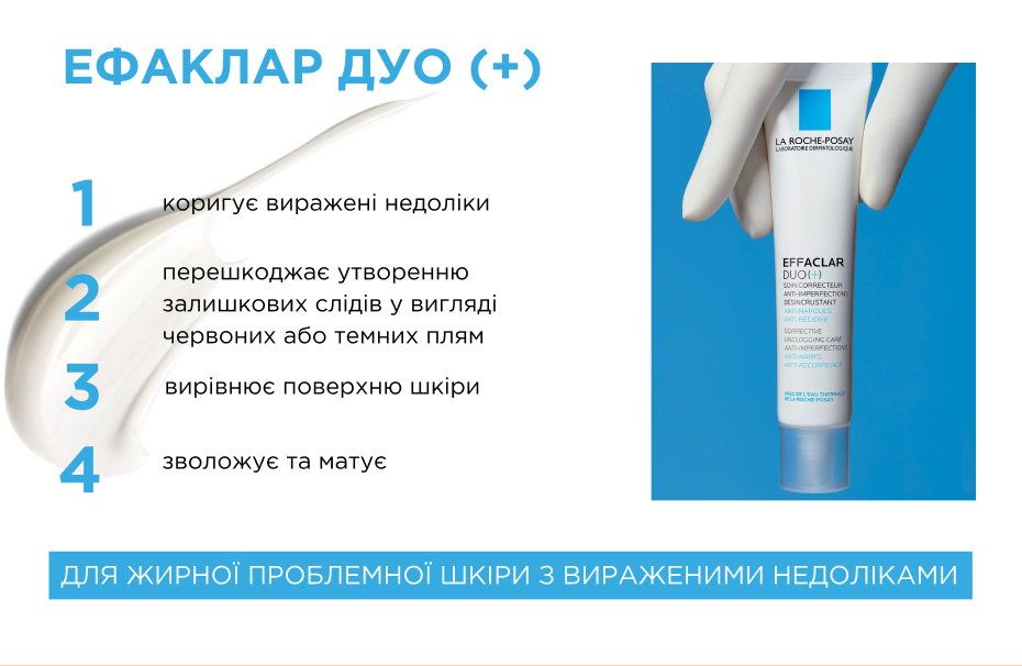 КОРРЕКТИРУЮЩИЙ КРЕМ-ГЕЛЬ EFFACLAR DUO(+) СПОСОБСТВУЕТ ДОСТИЖЕНИЮ ЗАМЕТНОГО ЭФФЕКТА В БОРЬБЕ против несовершенств, черных точек, закупоренных пор и постакне. Легкая формула средства увлажняет кожу 24 часа1 и обеспечивает длительный матирующий эффект, не закупоривая поры. Активный комплекс ингредиентов в составе крем-геля способствует сокращению количества несовершенств и комедонов (черных точек и закупоренных пор), предотвращая их повторное появление. Эксклюзивный церамид Прокерад предупреждает появление остаточных следов от несовершенств (постакне) в виде красных и темных пятен. Является отличной основой под макияж.