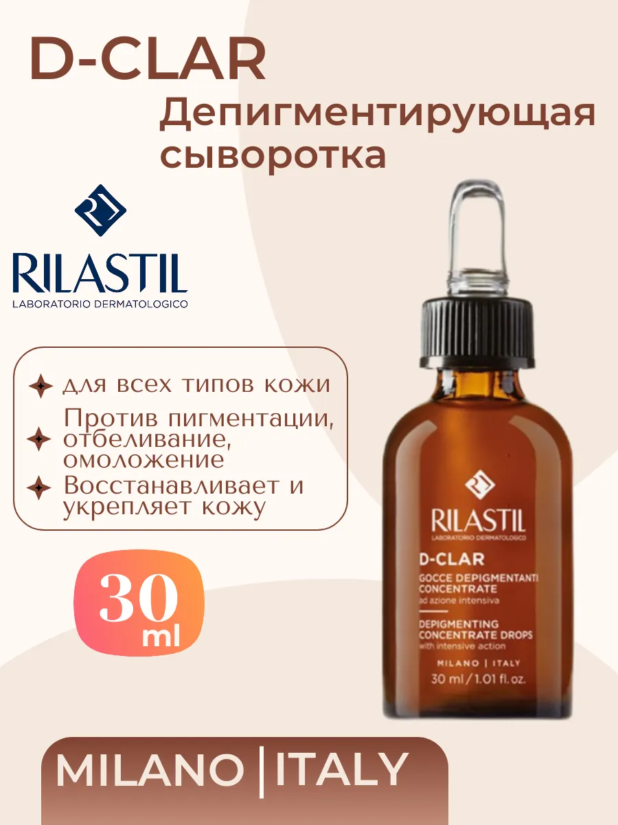 Rilastil D-Clar Depigmenting Concentrate Drops Интенсивное шоковое лечение любого типа кожной гиперхромии: пятна от солнца, меланодермия, шрамы от прыщей, поствоспалительная и индуцированная препаратами гиперхромия, неравномерный цвет лица. Имеет высокое содержание активных ингредиентов: