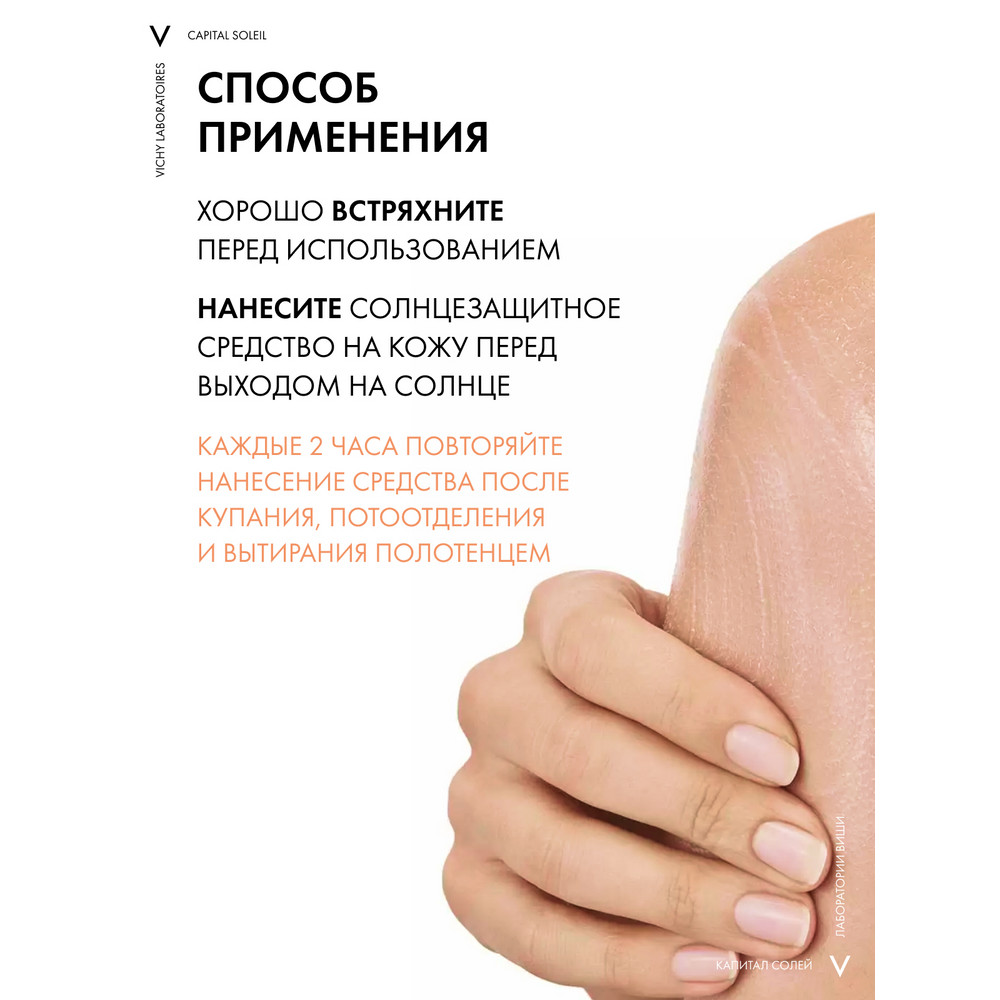 Избегайте зоны вокруг глаз. Для поддержания защиты каждые два часа и в достаточном количестве повторяйте нанесение средства, особенно после купания, интенсивного потоотделения и вытирания полотенцем.