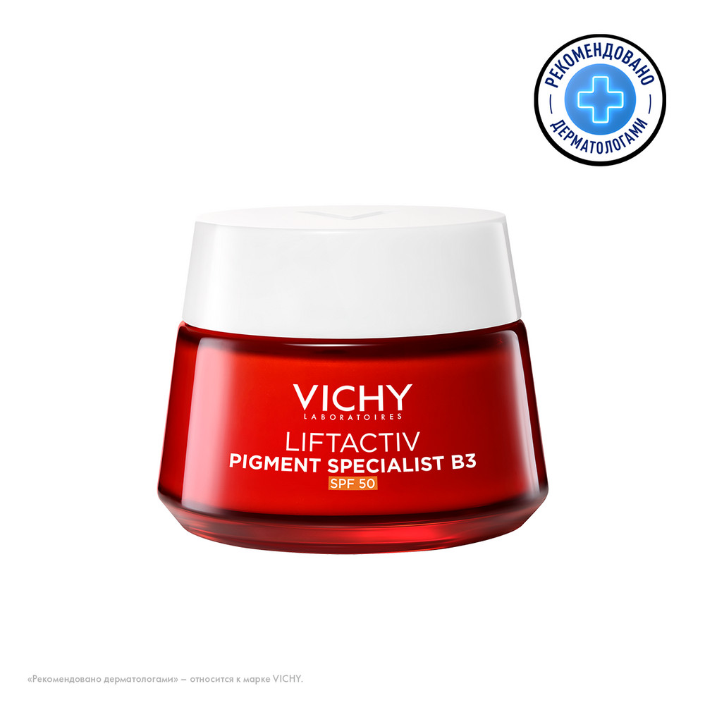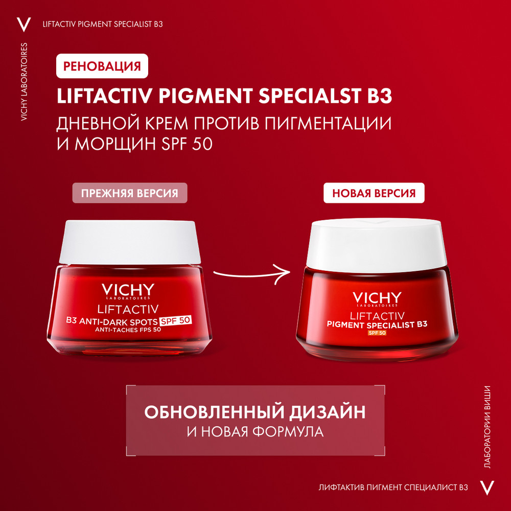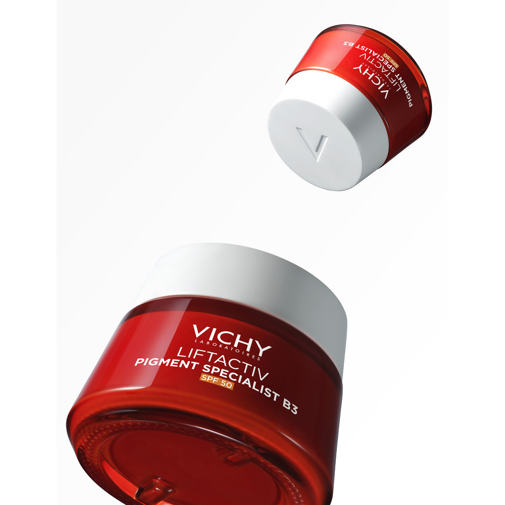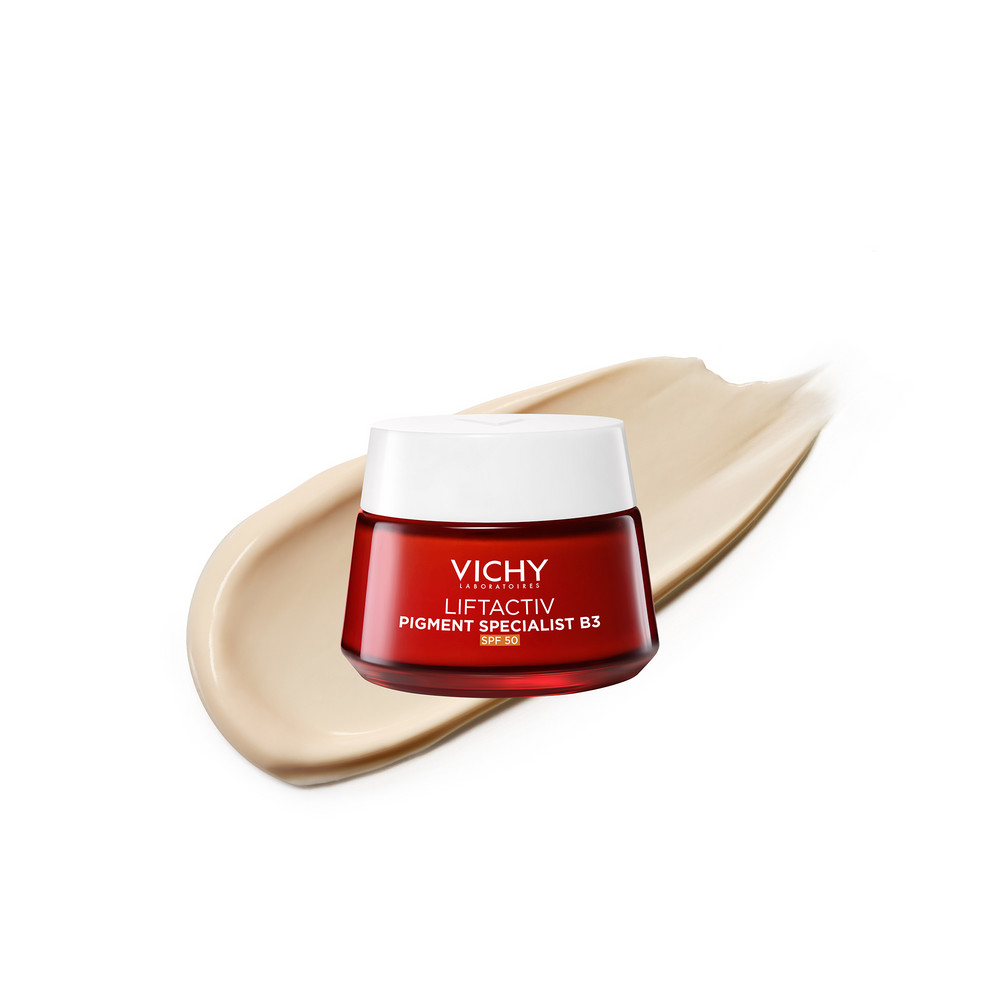 Инновация** от VICHY: новый дневной крем LIFTACTIV С ВИТАМИНОМ B3 ПРОТИВ ПИГМЕНТАЦИИ SPF 50 – улучшенный эффективный антивозрастной уход с ниацинамидом (витамин B3) и пептидами в сочетании с фильтром широкого спектра SPF 50.