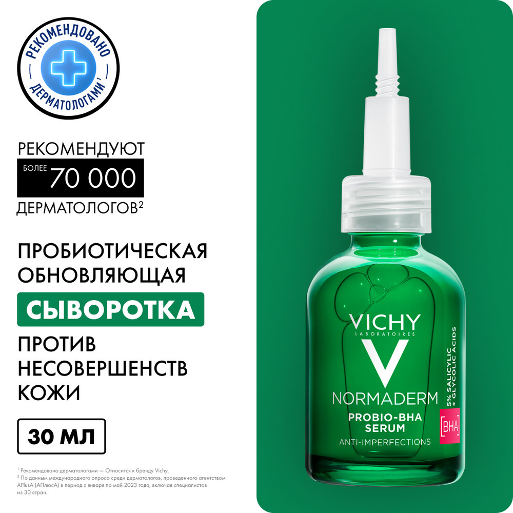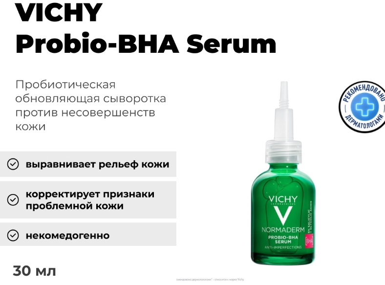 Лаборатории VICHY объединили Вулканическую воду VICHY с 5% Салициловой + Гликолевой кислотами и Пробиотической фракцией. Сыворотка выравнивает рельеф кожи и корректирует признаки проблемной кожи — несовершенства, черные точки и расширенные поры. Кожа обновлена и выглядит более здоровой. Гипоаллергенно. Некомедогенно.